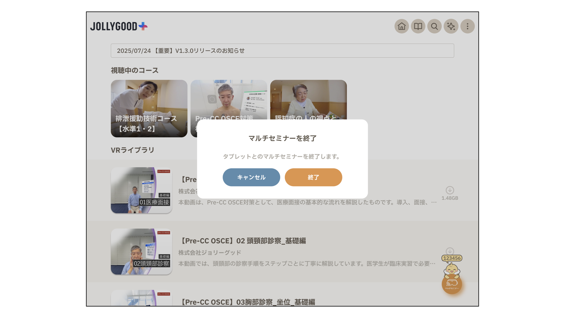 マルチセミナーを終了するには、各端末で「マルチセミナー」ボタンをタップし、「終了」ボタンをタップします。